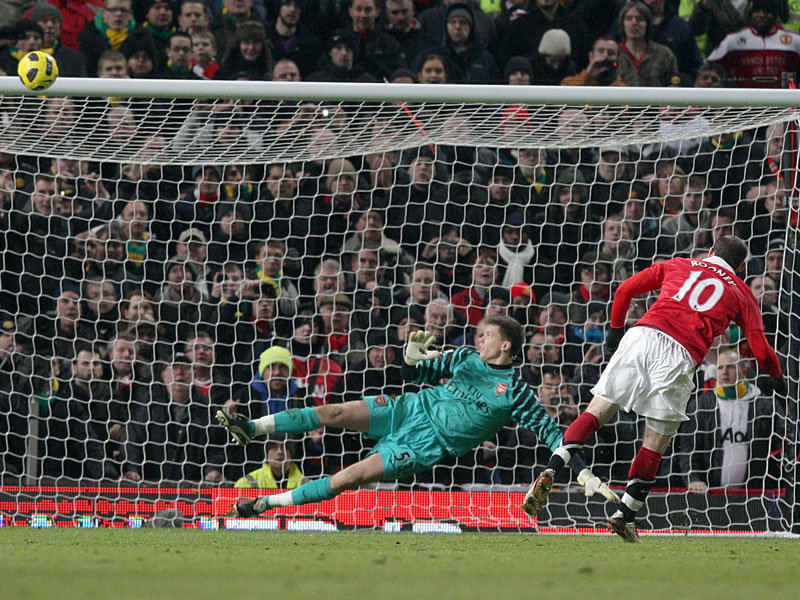 Mas o United seria beneficiado pelo destino, aos 27 minutos. Em contra-ataque, Nani recebeu a bola na esquerda, entrou pela área e chegou à linha de fundo. Tentando o cruzamento, o atacante tocou levemente na bola, e ela bateu no braço de Clichy. O árbitro Howard Webb, então, foi alertado pelo auxiliar e apitou o pênalti. Porém, a aparente ajuda de nada serviria: Rooney faria uma cobrança muito forte, e mandou a bola por cima do gol de Szczesny.